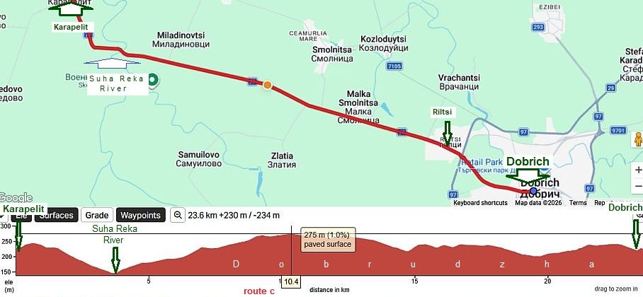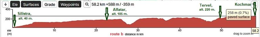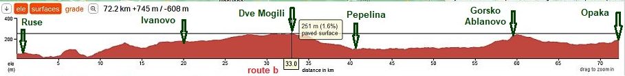 The route b is shorter than, the route a. As it can be seen from the road profile chart, the entire area is flat, but reavhimg Momchilovo, a long descending follows down to Provadia. This part of the route is not hard in the back direction - the route is very pleasant to be pedaled in the both directions at all. |