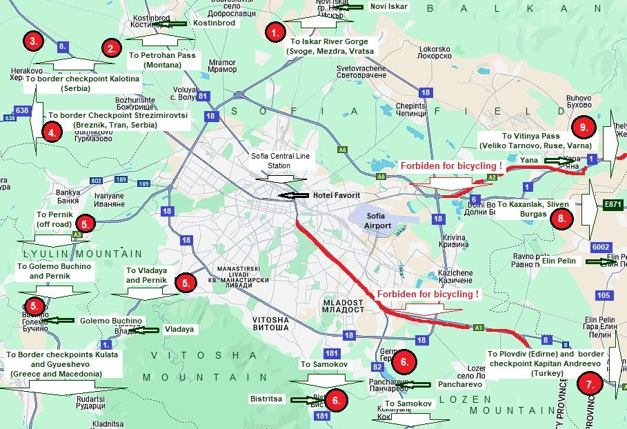 | On the next maps I have shown roads using to leave/enter Sofia (orientated towards Hotel Favorit), as well as I have pointed destinations of each road. | Again I will mention, that if you decide to leave Sofia pedaling, my suggestion is to do it early in the morning, no later than 6.30 am. So you definitely will avoid the intensive traffic in the town. |