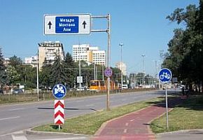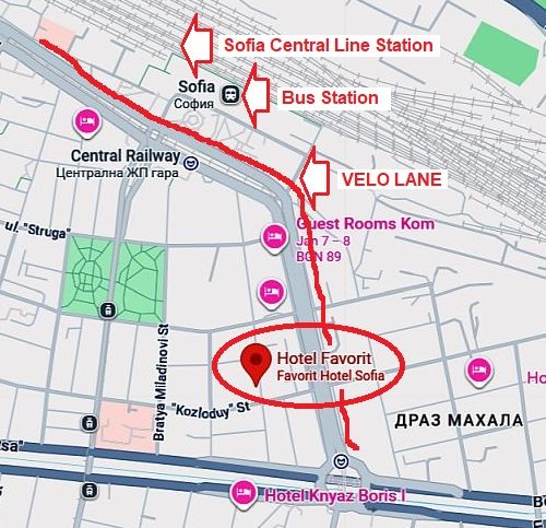 Entering in Sofia, you will see the velo lane (at your right side - it begins just after "Billa" Shop), it will lead you to the Central Railway Station Sofia and Hotel Favorit. (Hotel "Favorit" is just behind Hotel Princes - the high white building on the last photo below). |