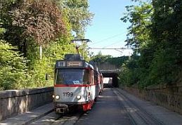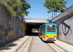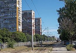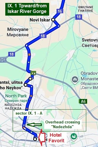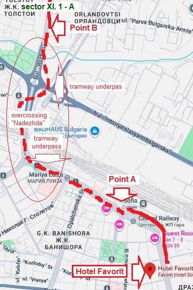 Sector IX. 1 - A Toward Iskar River Gorge In other to leave Sofia to North (Iskar River Gorge) you have to pedal Overhead Crossing “Nadezhda”, where the traffic is terrible. So, here I always prefer to bicycle between the tram line - it is the road segment between point A and point B on the map in left; the dashed green lines are the tramway underpasses. Do not be afraid to pedal just next to the tram line (or between the lines). Here trams are moving very slowly, their speed is no more than 15 km/hours. There is enough space to shift left, right or between lines and leave the tram to pass you by if necessary. The trams |