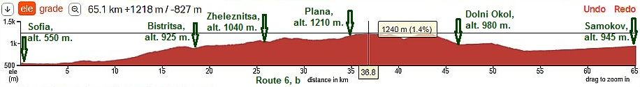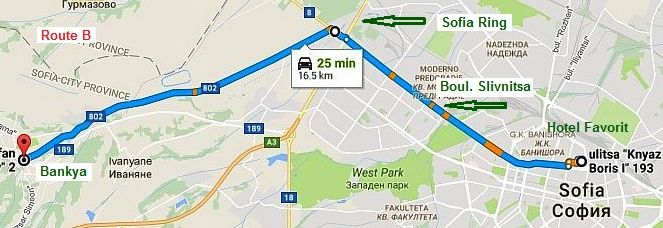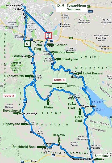 Route b: From Sofia to Bistritsa to Zheleznitsa to Plana to Dolni Okol to Gorni Okol to Samokov. But . . . I can not suggest an appropriate route between the hotel Favorit and Sofia ring. The crossing of Sofia in this direction is not easy (having in mind the traffic). |