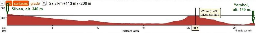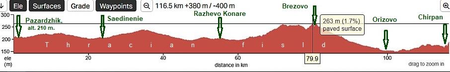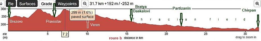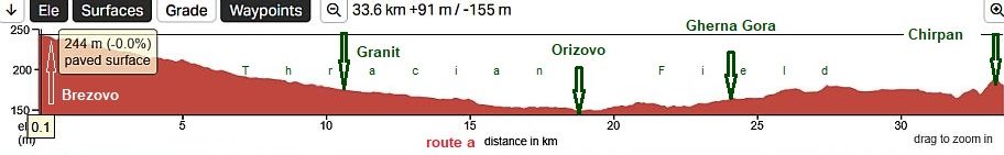 Road profile chart from Plovdiv to Chirpan. There are a lot of low rolling hills making the views more scenic. | |