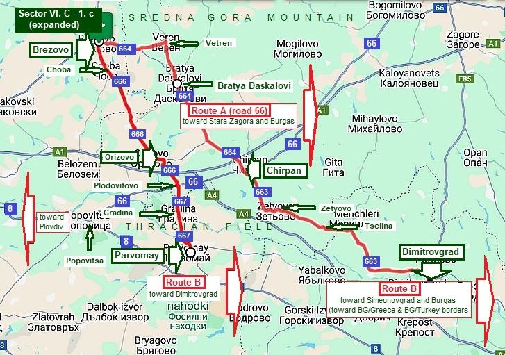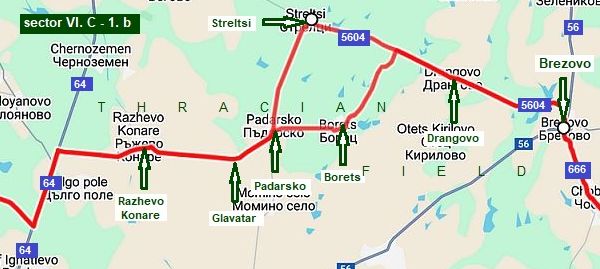Sector VI. C - 1. b There are two possible routes here: From road 64 toward Razhevo Konare to Glavatar to Padarsko to Borets to Drangovo to Brezovo. The next one includes Streltsi. Both routes are with very little traffic, food is available in villages along the road. |