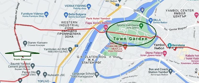 Bolyarovo is: Routes a & b & c From Elhovo to Dobrich to Zlatinitsa to Bolyarovo. |