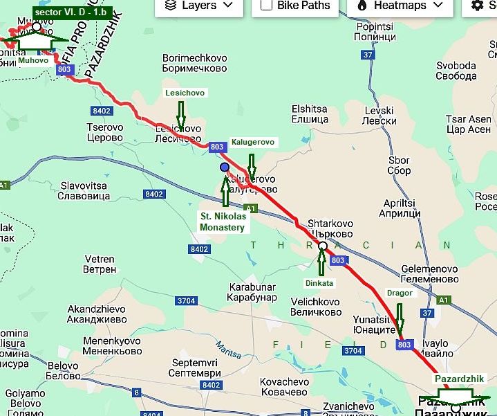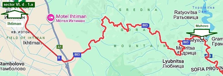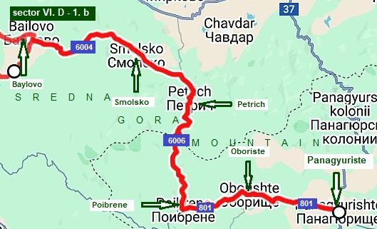 SectorVI. D - 1. b - 1. a Follow the route: From Belovo (road 8) to Semchinovo (road 8404) to Simeonovets to Varvara to Vetren Dol to Patalenitsa (road 3706) to Lyahovo to Mokriste to Pazardzhik.