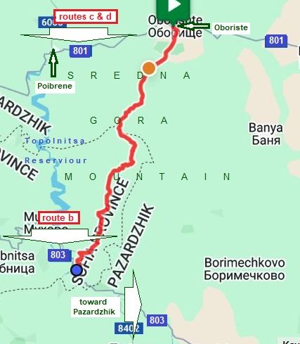 In this sector I will give five opportunities (routes a - e) to reach Pazardzhik from Sofia. You can choose the best of you according the time you have and area you would prefer to explore. In addition I will add extra opportunities for shortcuts between routes shown here.