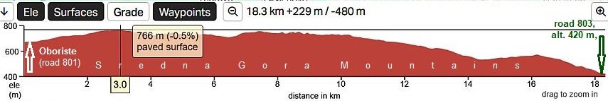 This is one of the most pleasant road segments for bicycling and the road profile chart shows it. This part of route is not hard in the reverse direction either, even with the many kilometers of a grade. |