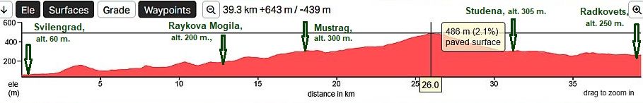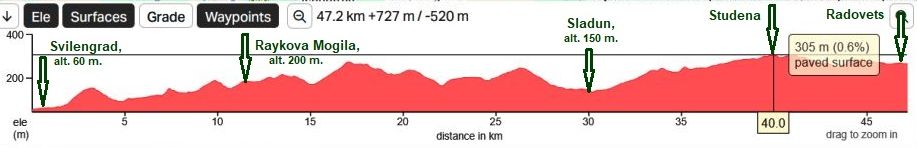 The route a is crossing the low west end of Rodopi Mountain and as it can be seen from the road profile charts below, here there is climbing. So, to bicyclists who do not love climbing, I would suggest to use the next route: