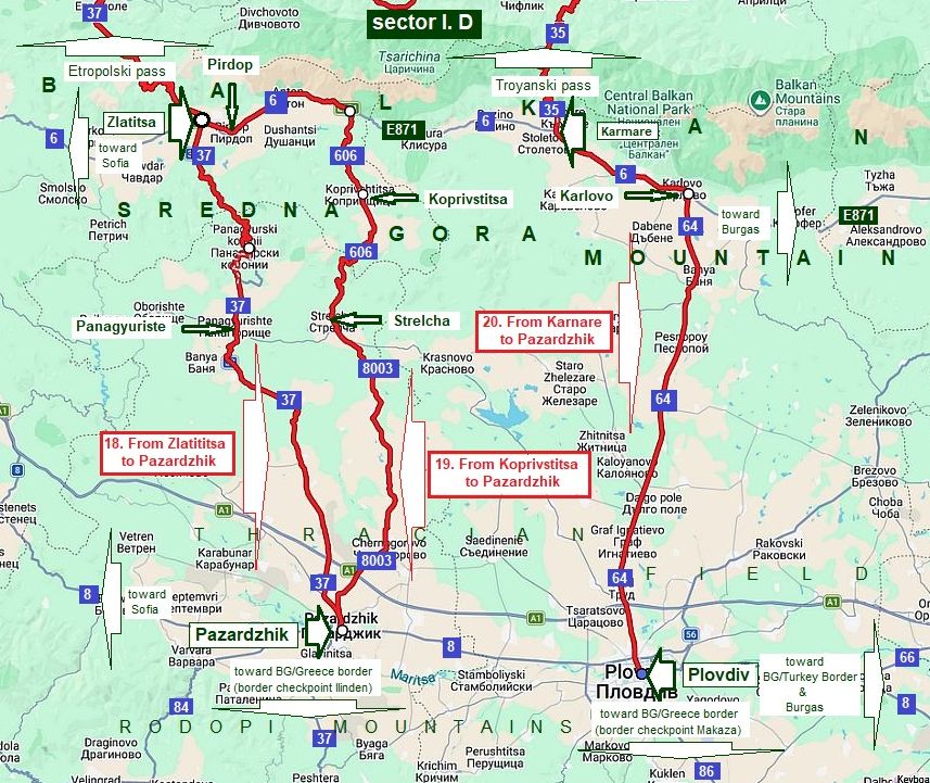 18. From Zlatitsa to Panagyuriste to Pazardzhik (road 37); 19. From Zlatitsa to Koprivstitsa to Pazardzhik (roads 606 & 8003); 20. From Karnare to Karlovo to Plovdiv (road 64).