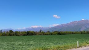 The next six photos show the countryside along route a from E871 toward Pavel Banya in the sunny April '25. Photos can not impress the great view toward Balkan Mountains.